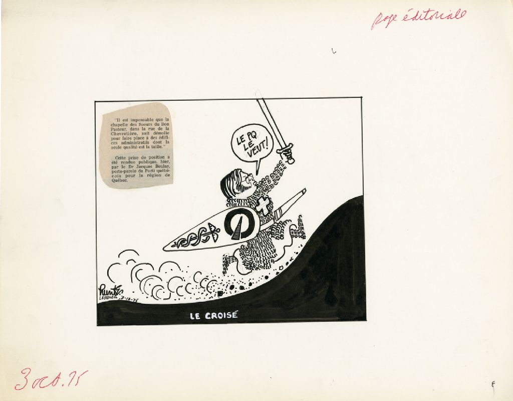 On peut lire sur une coupure de presse collée sur le dessin : «Il est impensable que la chapelle des Soeurs du Bon Pasteur, dans la rue de la Chevrotière, soit démolie pour faire place à des édifices administratifs dont la seule qualité est la taille. Cette prise de position a été rendue publique, hier, par le Dr Jacques Boulay, porte-parole du Parti québécois pour la région de Québec»