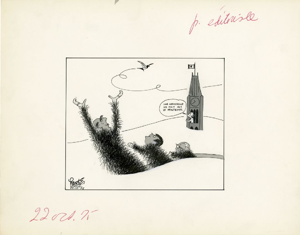 «Une hirondelle ne fait pas le printemps», 21 octobre 1975, Archives nationales à Québec, Fonds Raoul Hunter, (03Q,P716,S1,P75-10-22), Raoul Hunter.