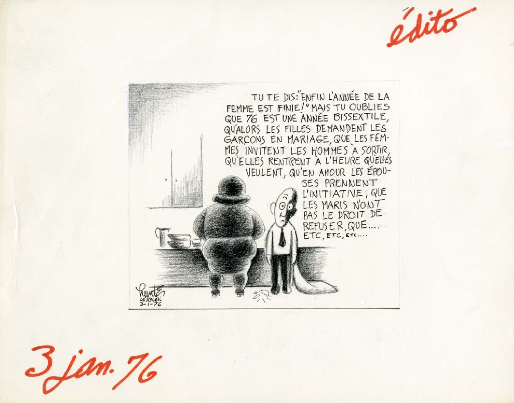«Tu te dis : «Enfin l'année de la femme est finie!» Mais tu oublies que 76 est une année bissextile, qu'alors les filles demandent les garçons en mariage, que les femmes invitent les hommes à sortir, qu'elles rentrent à l'heure qu'elles veulent, qu'en amour les épouses prennent l'initiative, que les maris n'ont pas le droit de refuser, que... etc, etc, etc...»