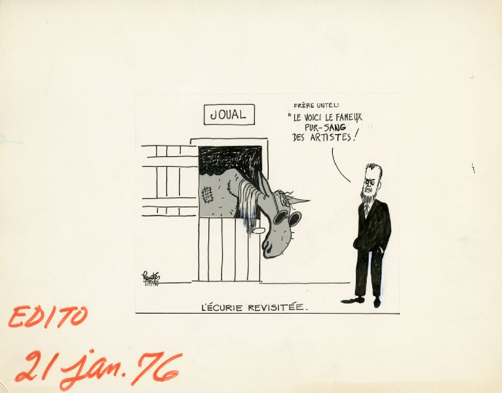 L'écurie revisitée. Frère Untel : «Le voici le fameux pur-sang des artistes!», 21 janvier 1976, Archives nationales à Québec, Fonds Raoul Hunter, (03Q,P716,S1,P76-01-21), Raoul Hunter.
