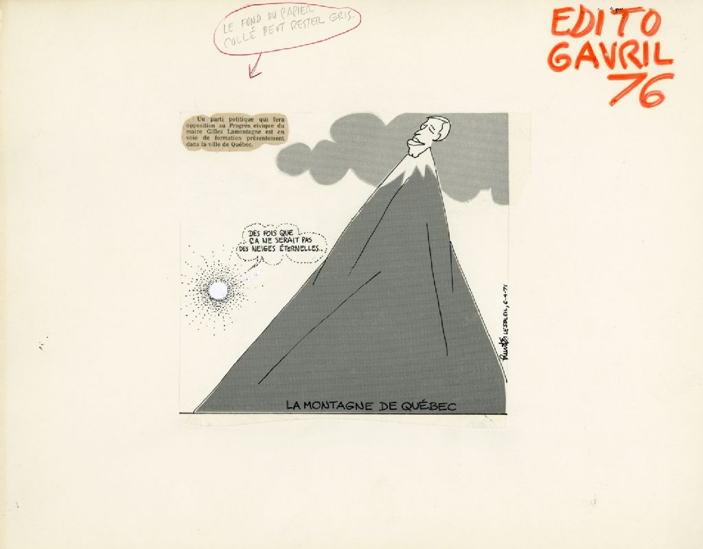 On peut lire sur une coupure de presse collée sur le dessin : «Un parti politique qui fera opposition au Progrès civique du maire Gilles Lamontagne est en voie de formation présentement dans la ville de Québec.»