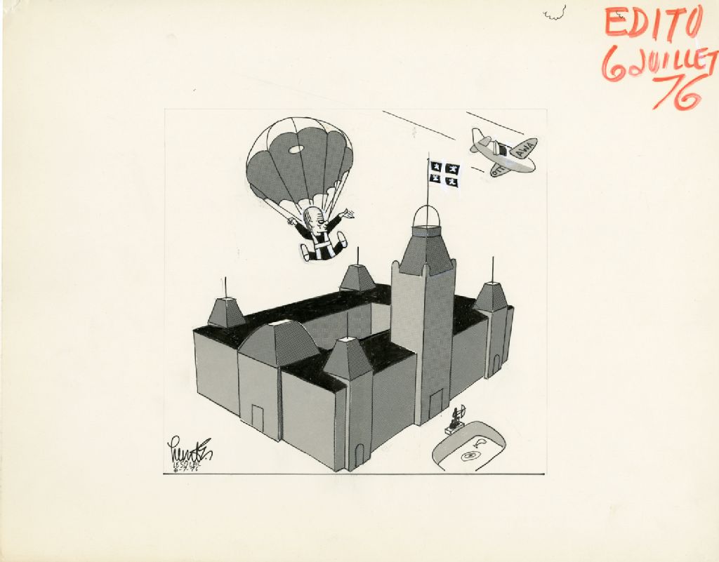 [René Lévesque est parachutiste qui va atterrir à l'Hôtel du Parlement]