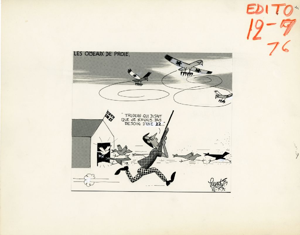 Les oiseaux de proie. «Trudeau qui disait que je n'avais pas besoin d'une 22...», 12 juillet 1976, Archives nationales à Québec, Fonds Raoul Hunter, (03Q,P716,S1,P76-07-12), Raoul Hunter.