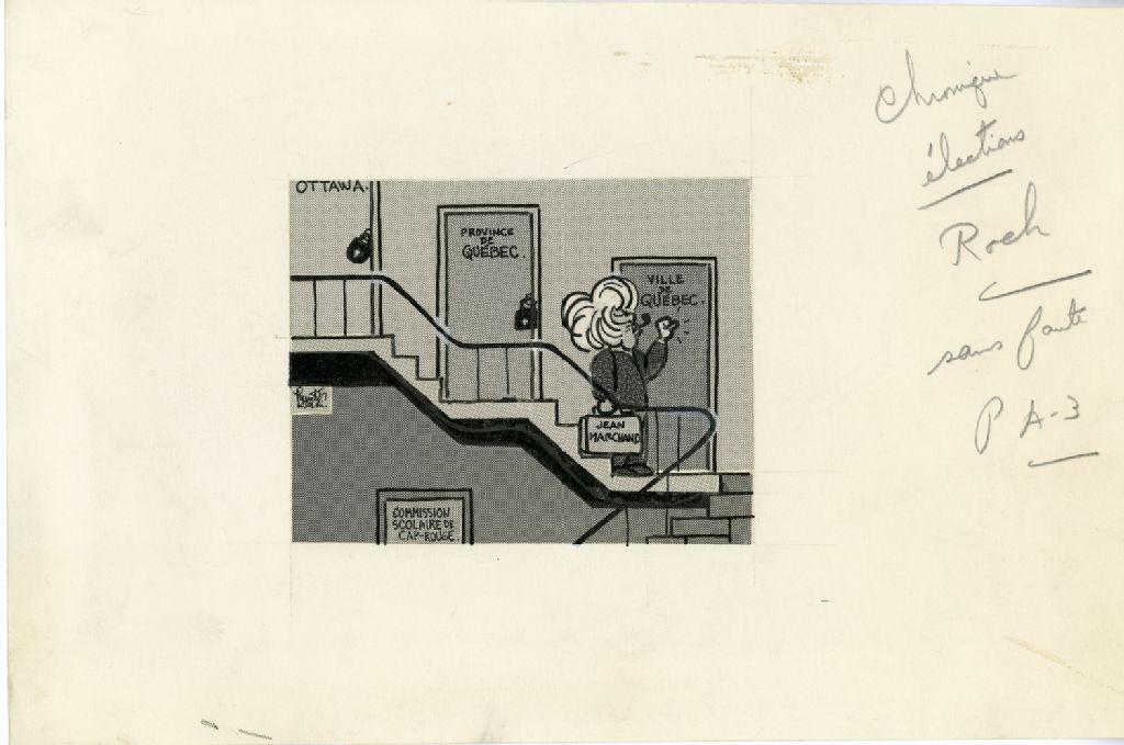 [Jean Marchand cogne à une porte où on peut lire ''Ville de Québec'']