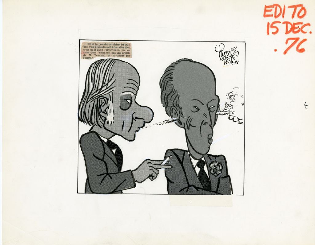 [René Lévesque souffle de la fumée de sa cigarette dans l'oreille de Pierre-Eliott Trudeau], 15 décembre 1976, Archives nationales à Québec, Fonds Raoul Hunter, (03Q,P716,S1,P76-12-15), Raoul Hunter.