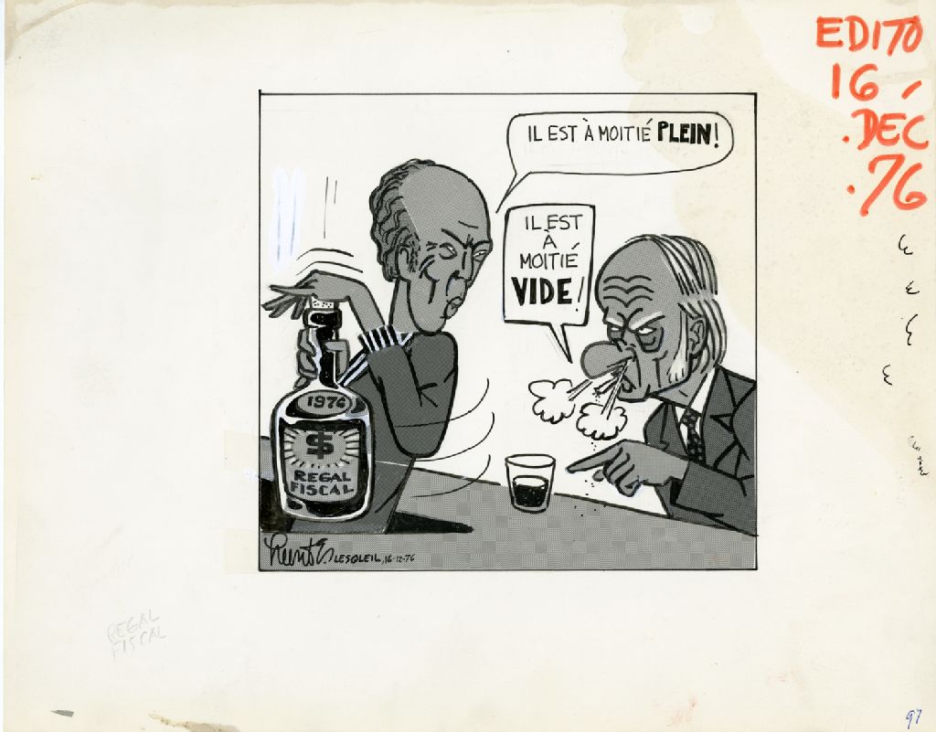 «Il est à moitié plein!» «Il est à moitié vide!», 16 décembre 1976, Archives nationales à Québec, Fonds Raoul Hunter, (03Q,P716,S1,P76-12-16-2), Raoul Hunter.