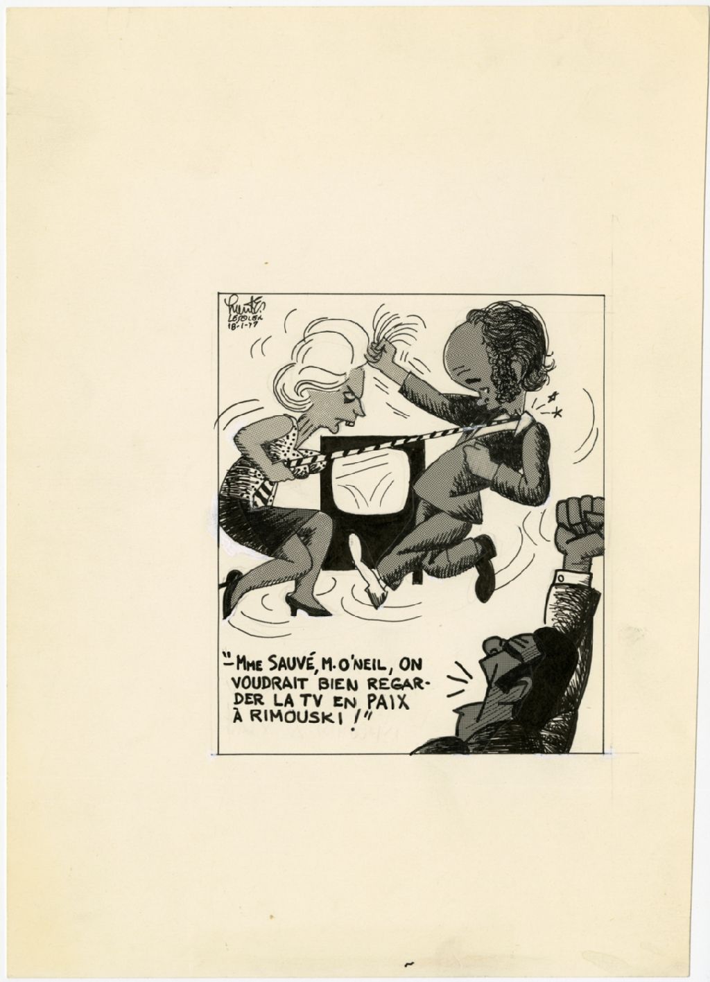 «Mme Sauvé, M. O'Neil, on voudrait bien regarder la tv en paix à Rimouski!», 18 janvier 1977, Archives nationales à Québec, Fonds Raoul Hunter, (03Q,P716,S1,P77-01-18-2), Raoul Hunter.