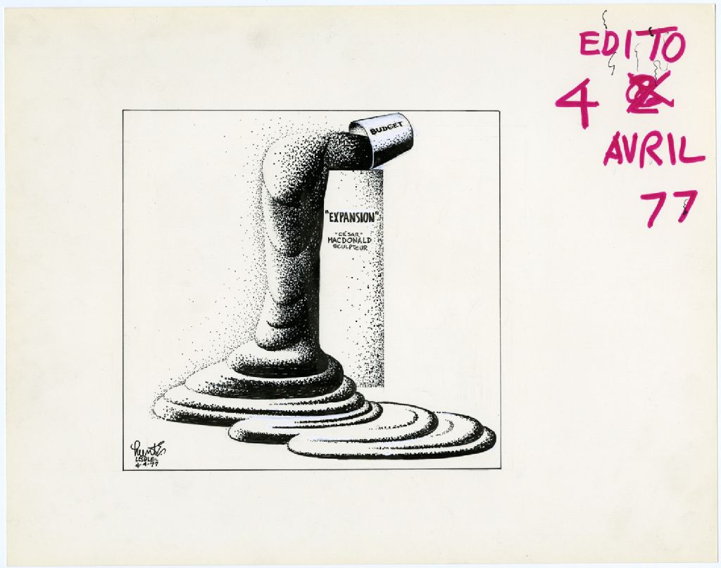 [Une sculpture nommé ''Expansion'' César Macdonald sculpteur où on voit de l'huile qui coule d'un sceau]
