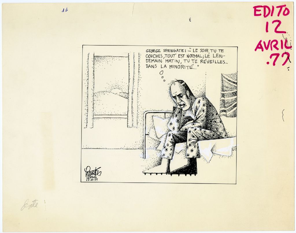 George Springate : «Le soir, tu te couches, tout est normal; le lendemain matin, tu te réveilles... dans la minorité», 12 avril 1977, Archives nationales à Québec, Fonds Raoul Hunter, (03Q,P716,S1,P77-04-12), Raoul Hunter.
