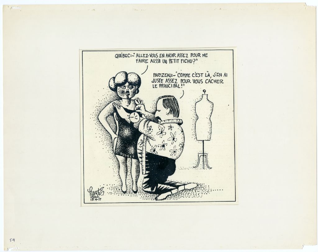 Québec : - «Allez-vous en avoir assez pour me faire aussi un petit fichu?» Parizeau : - «Comme c'est là, j'en ai juste assez pour vous cacher le principal!»