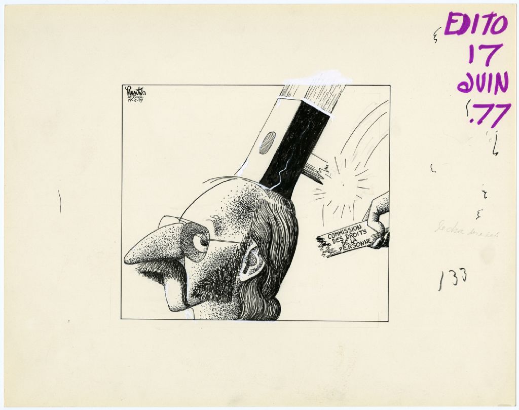 [Un homme reçoit un coup de masse sur la tête. On peut lire sur le manche ''Commission des droits de la personne'']