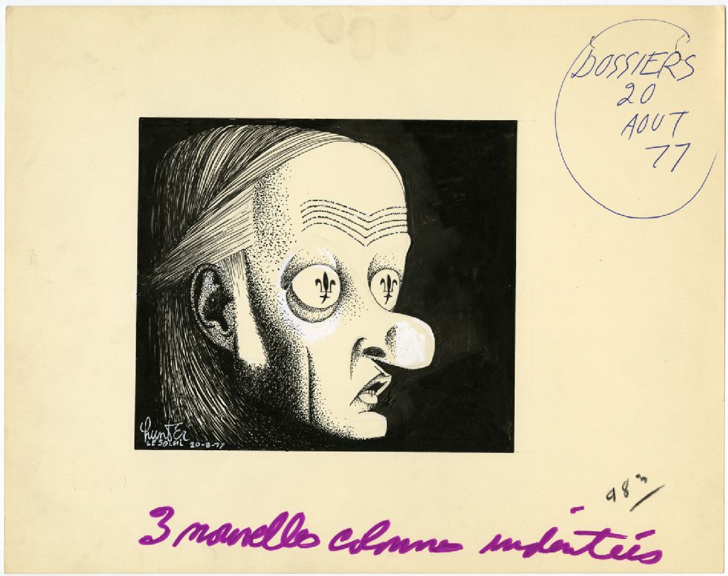 [René Lévesque avec des fleur de lys à la place des yeux], 20 août 1977, Archives nationales à Québec, Fonds Raoul Hunter, (03Q,P716,S1,P77-08-20-1), Raoul Hunter.