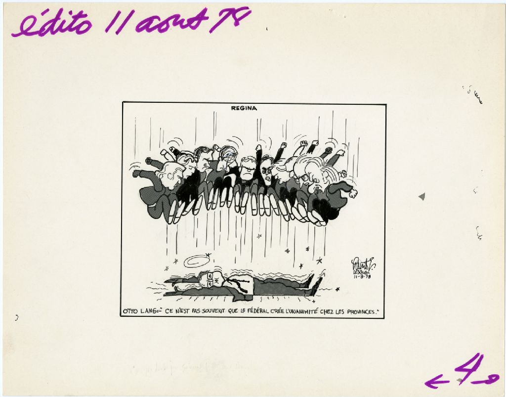 Régina. Otto Lang : «Ce n'est pas souvent que le fédéral crée l'unanimité chez les provinces», 11 août 1978, Archives nationales à Québec, Fonds Raoul Hunter, (03Q,P716,S1,P78-08-11-1), Raoul Hunter.