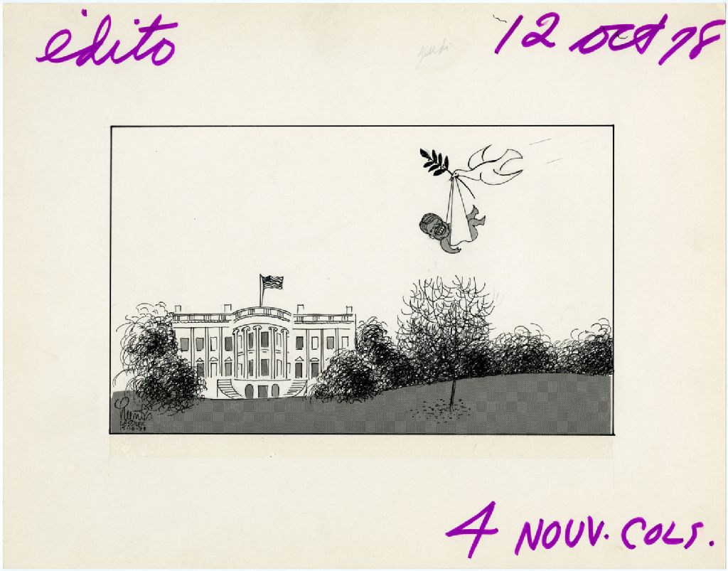 [Jimmy Carter, en bébé, transporté par une cigogne, arrive à la Maison Blanche]