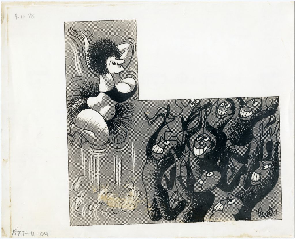 [Une femme saute en sous-vêtement devant des hommes], 4 novembre 1978, Archives nationales à Québec, Fonds Raoul Hunter, (03Q,P716,S1,P78-11-04-1), Raoul Hunter.