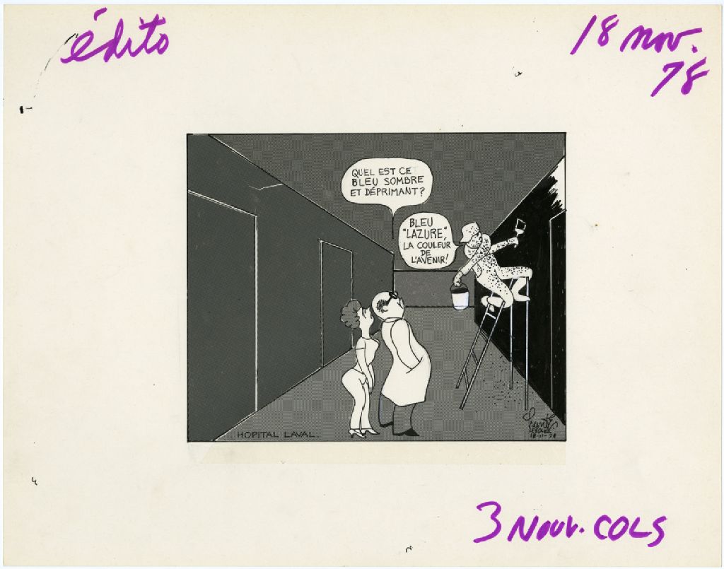 Hôpital Laval. «Quel est ce bleu sombre et déprimant?» «Bleu «Lazure», la couleur de l'avenir!»