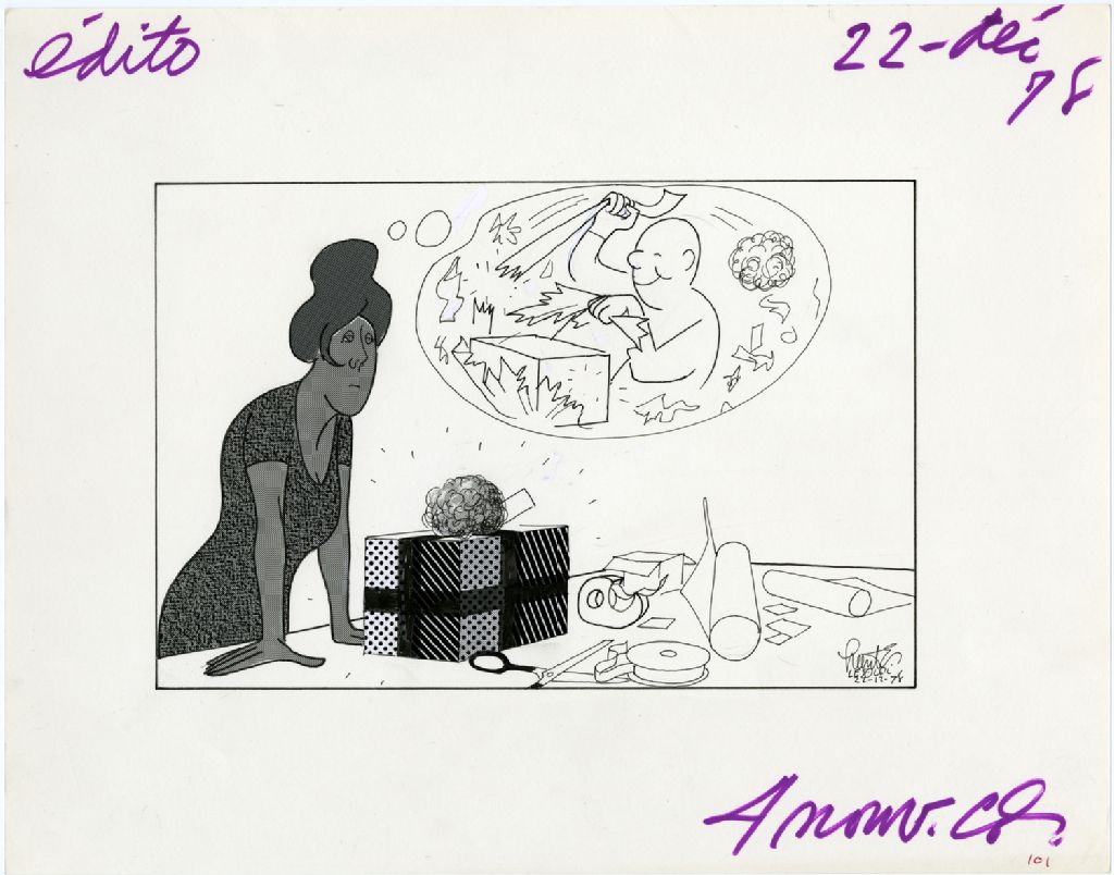 [Une femme regarde un cadeau qu'elle a emballé]