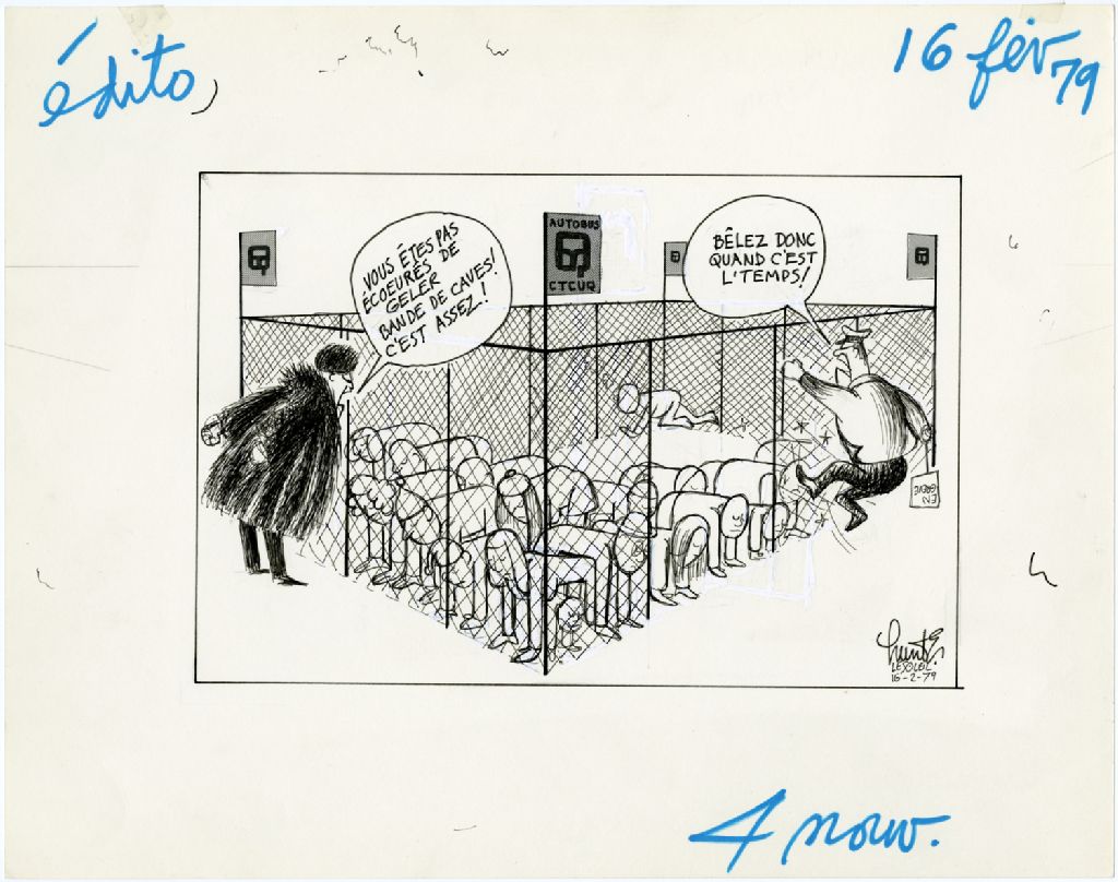 «Vous êtes pas écoeurés de geler bande de caves! C'est assez!» «Bêlez donc quand c'est l'temps!», 16 février 1979, Archives nationales à Québec, Fonds Raoul Hunter, (03Q,P716,S1,P79-02-16), Raoul Hunter.