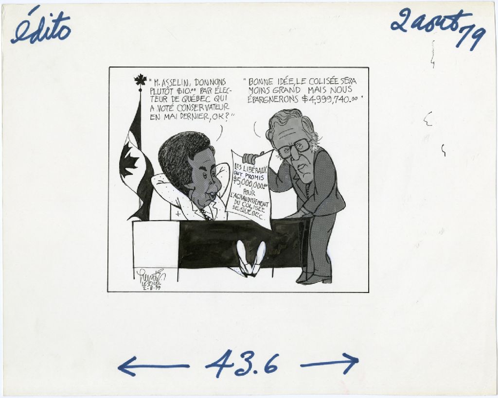 Les libéraux ont promis $5,000,000.00 pour l'agrandissement du Colisée de Québec. «M. Asselin, donnon plutôt $10.00 par électeur de Québec qui a voté conservateur en mai dernier, OK?» «Bonne idée, le Colisé sera moins grand mais nous épargnerons $4,999,740.00»