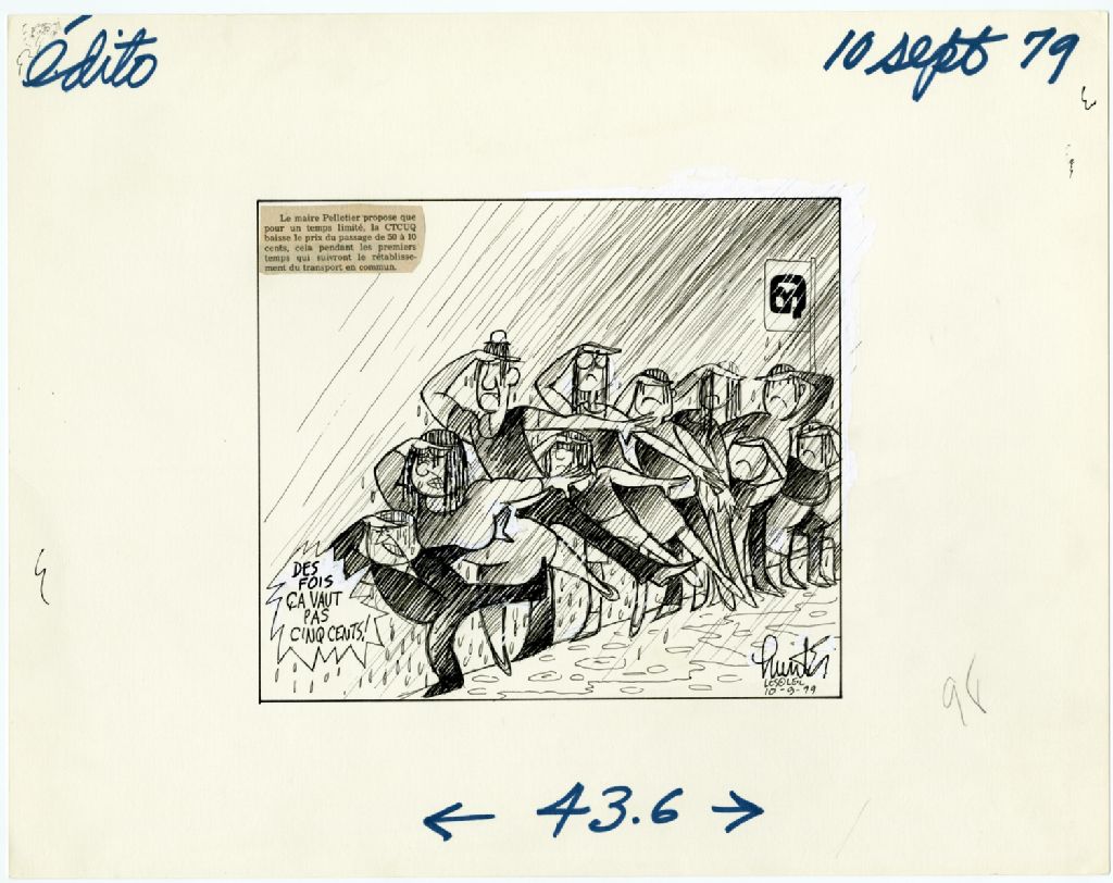 On peut lire sur une coupure de presse collée sur le dessin : «Le maire Pelletier propose que pour un temps limité, la CTCUQ baisse le prix du passage de 50 à 10 cents, cela pendant les premiers temps qui suivront le rétablissement du transport en commun.»