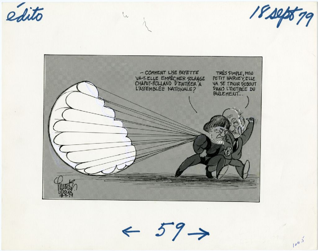 «Comment Lise Payette va-t-elle empêcher Solange Chaput-Rolland d'entrer à l'Assemblée nationale?» «Très simple, mon petit Harvey, elle va se tenir debout dans l'entrée du Parlement...», 18 septembre 1979, Archives nationales à Québec, Fonds Raoul Hunter, (03Q,P716,S1,P79-09-18), Raoul Hunter.