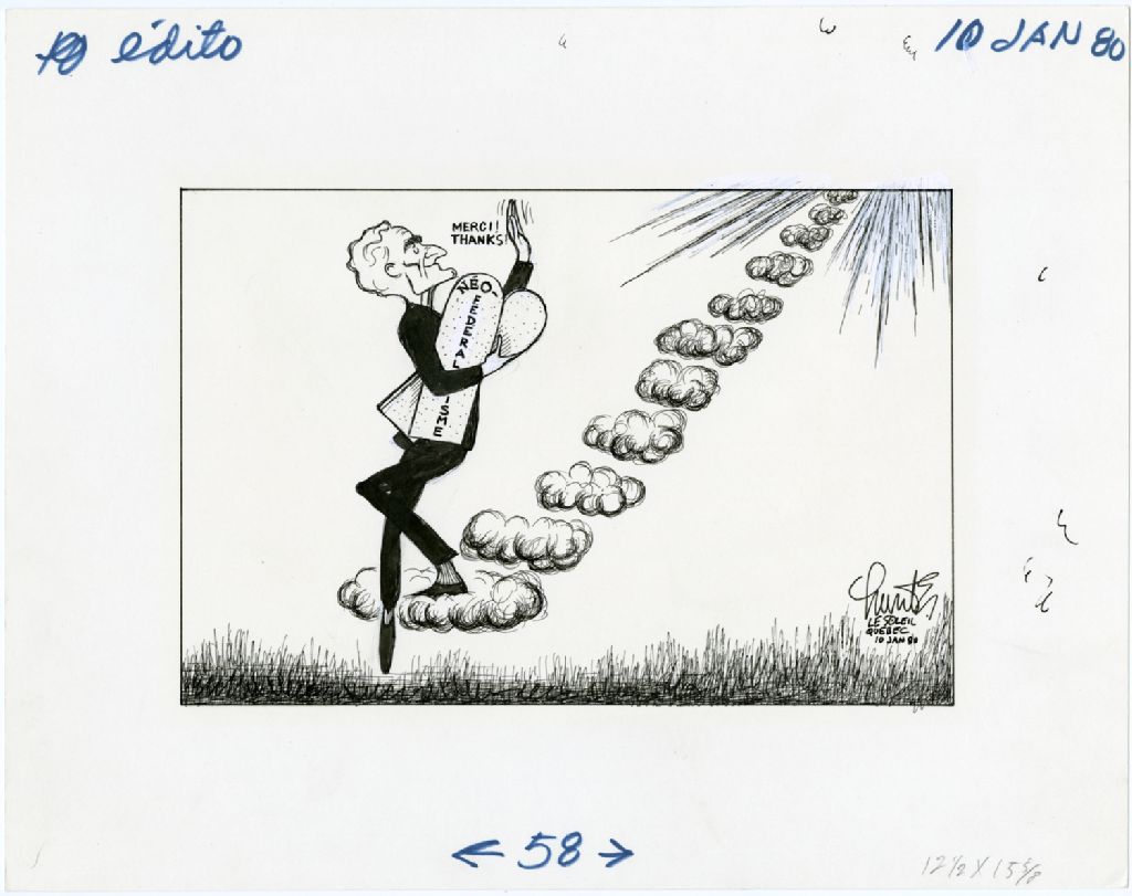 [Claude Ryan descend du ciel avec des tablettes où on peut lire ''Néo Fédéralisme''], 10 janvier 1980, Archives nationales à Québec, Fonds Raoul Hunter, (03Q,P716,S1,P80-01-10), Raoul Hunter.