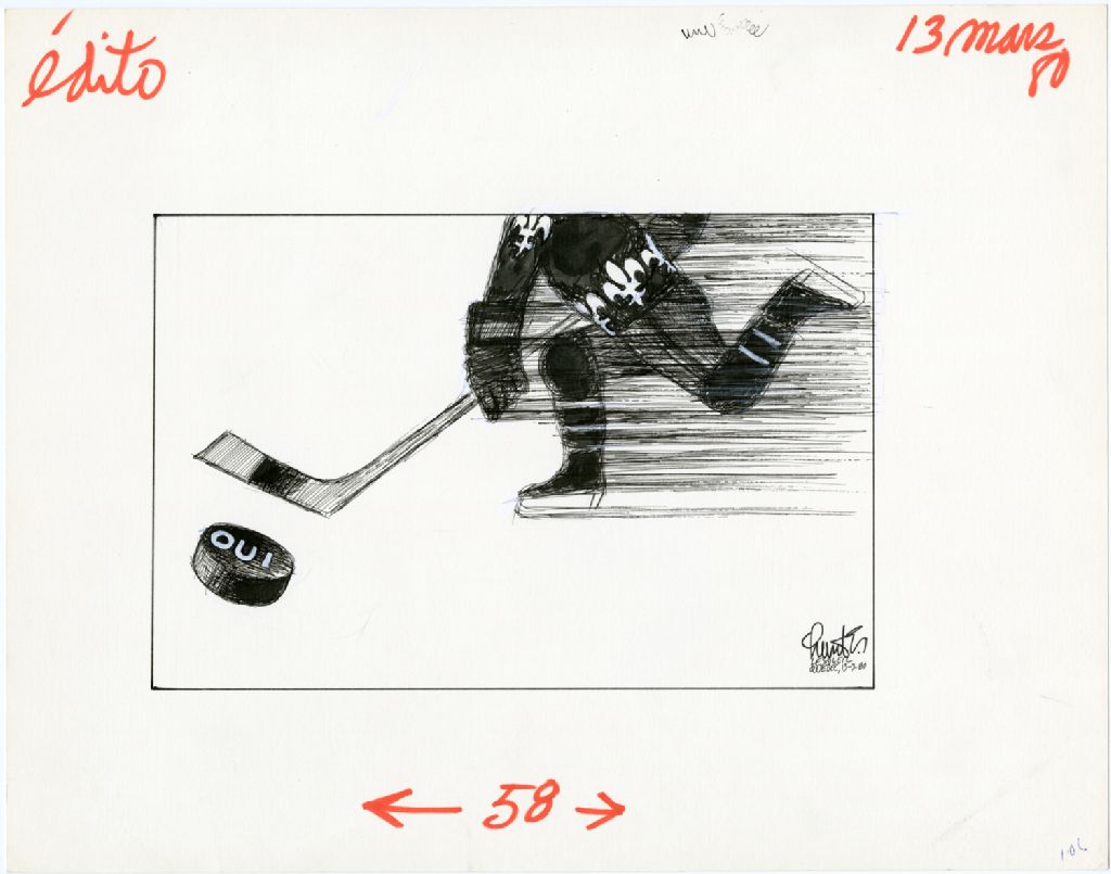 [Un joueur des Nordiques et une rondelle d'hockey où on peut lire ''Oui'']
