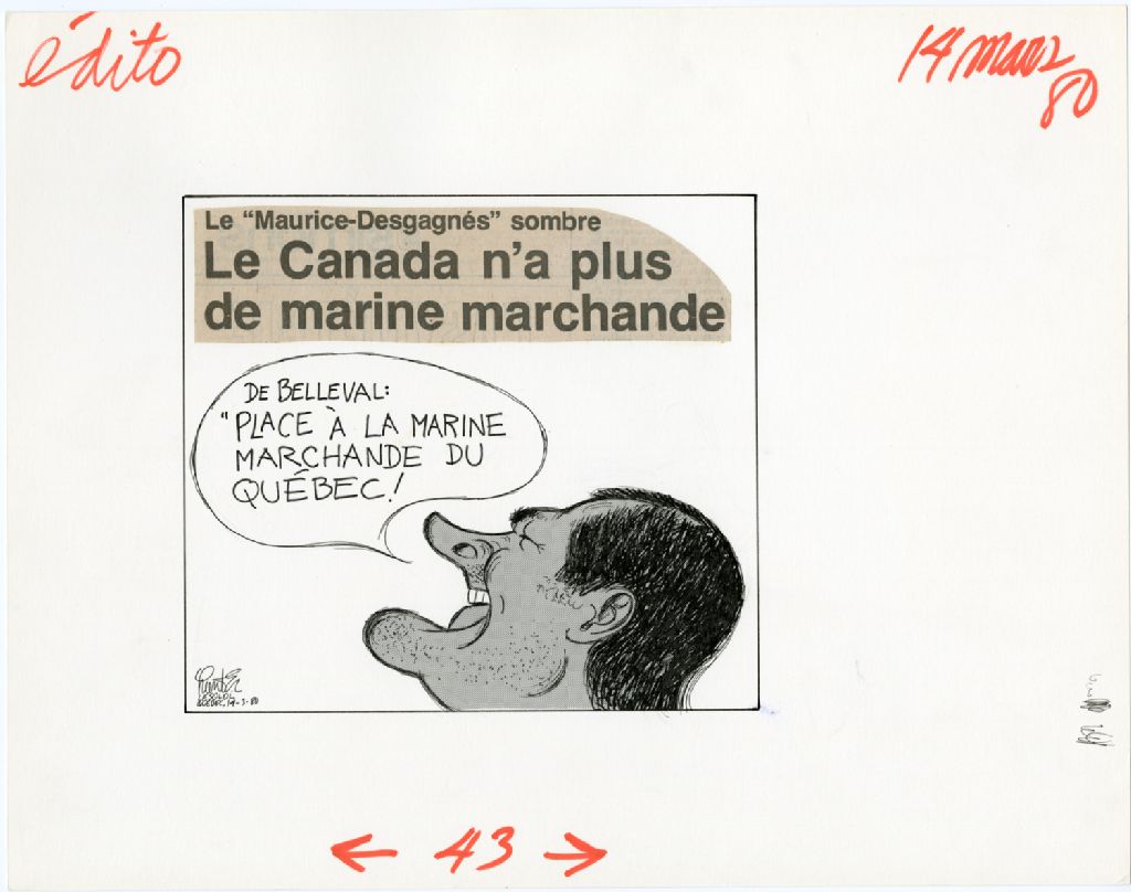 De Belleval : «Place à la marine marchande du Québec!», 14 mars 1980, Archives nationales à Québec, Fonds Raoul Hunter, (03Q,P716,S1,P80-03-14), Raoul Hunter.