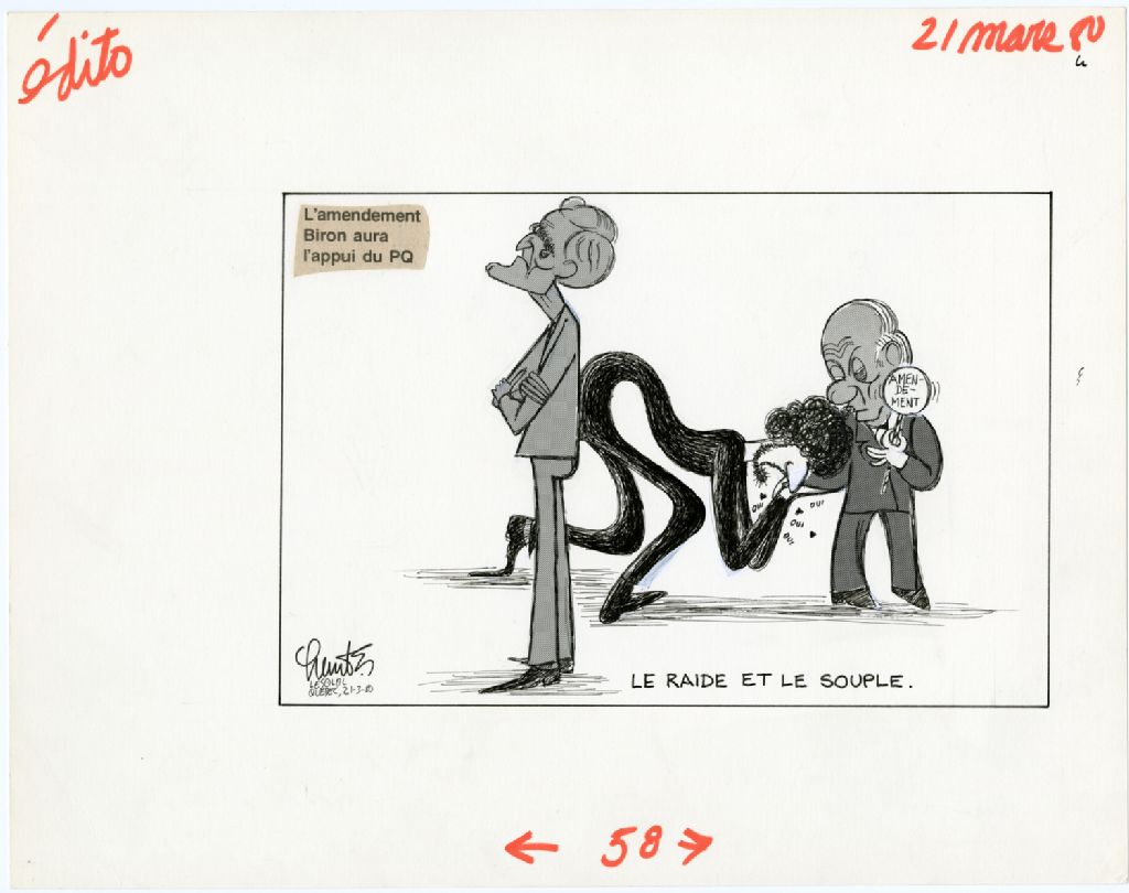 On peut lire sur une coupure de presse collée sur le dessin : «L'amendement Biron aura l'appui du PQ»