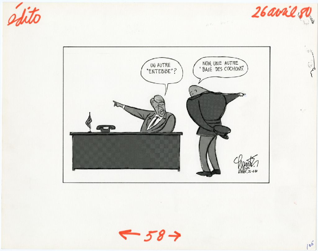 «Un autre «Entebbe»?» «Non, une autre «Baie des cochons»», 26 avril 1980, Archives nationales à Québec, Fonds Raoul Hunter, (03Q,P716,S1,P80-04-26), Raoul Hunter.