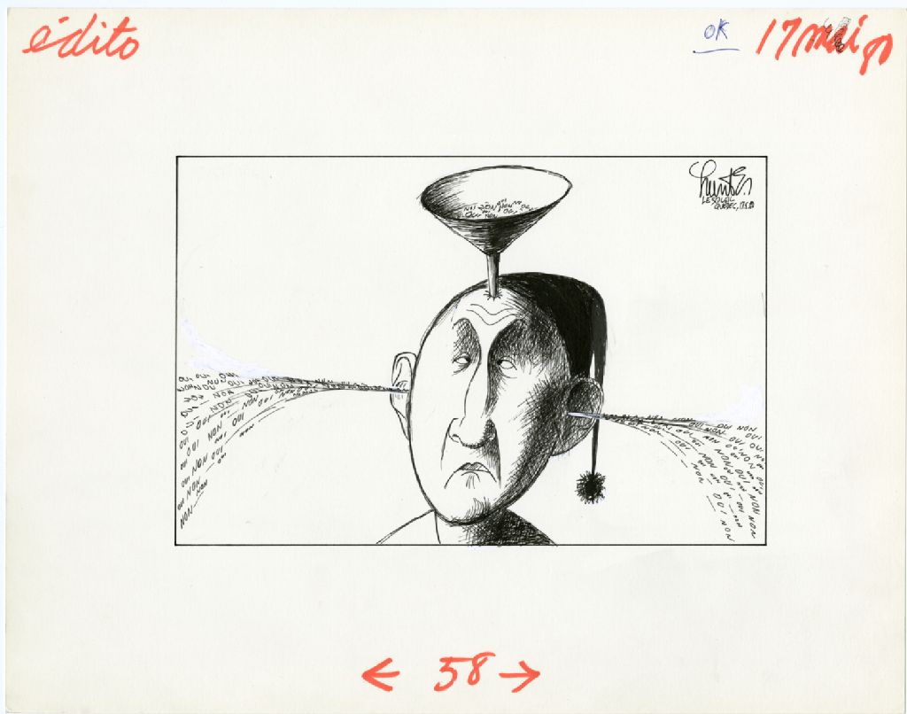 [Un homme a un entonnoir sur la tête et des mots qui sortent de ses oreilles], 17 mai 1980, Archives nationales à Québec, Fonds Raoul Hunter, (03Q,P716,S1,P80-05-17), Raoul Hunter.