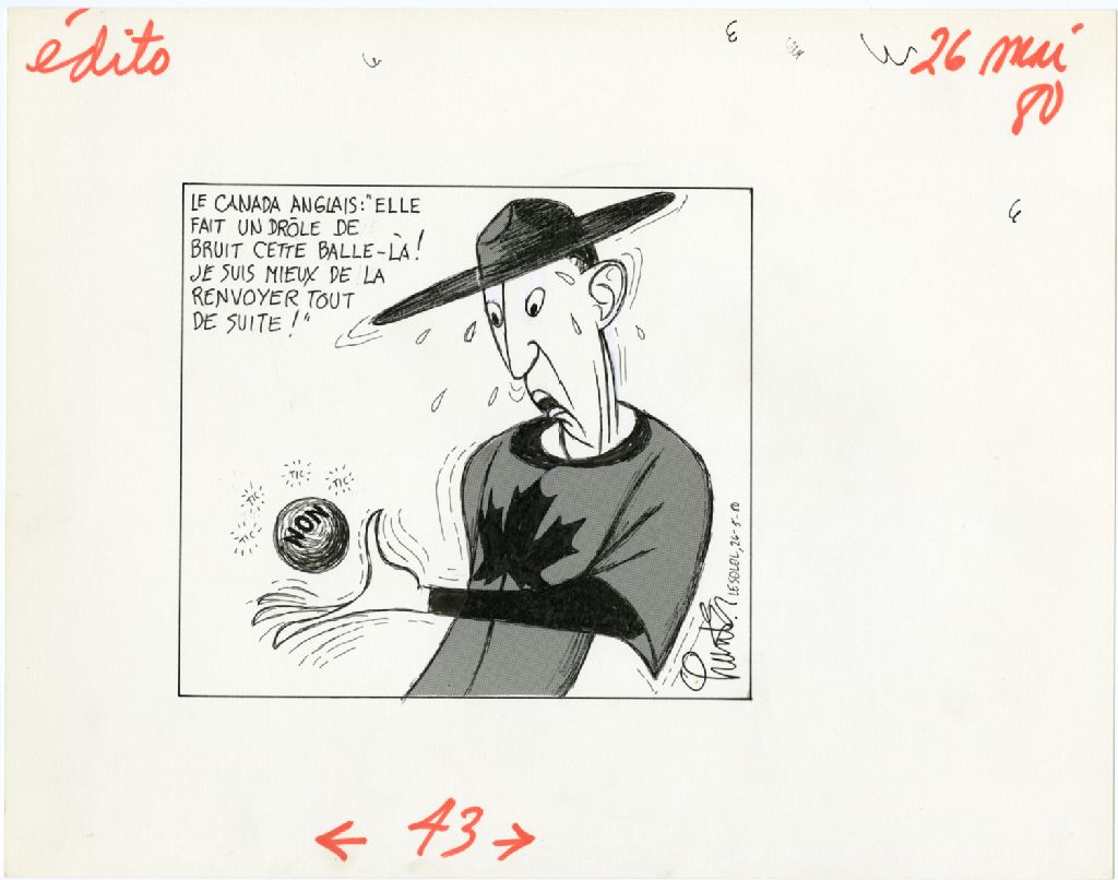 Le Canada anglais : «Elle fait un drôle de bruit cette balle-là! Je suis mieux de la renvoyer tout de suite!», 26 mai 1980, Archives nationales à Québec, Fonds Raoul Hunter, (03Q,P716,S1,P80-05-26), Raoul Hunter.
