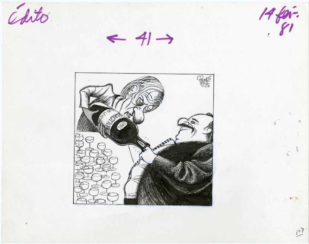 [René Lévesque essaie de verser du vin, mais Jacque Parizeau bouche la bouteille de son doigt], 14 février 1981, Archives nationales à Québec, Fonds Raoul Hunter, (03Q,P716,S1,P81-02-14), Raoul Hunter.