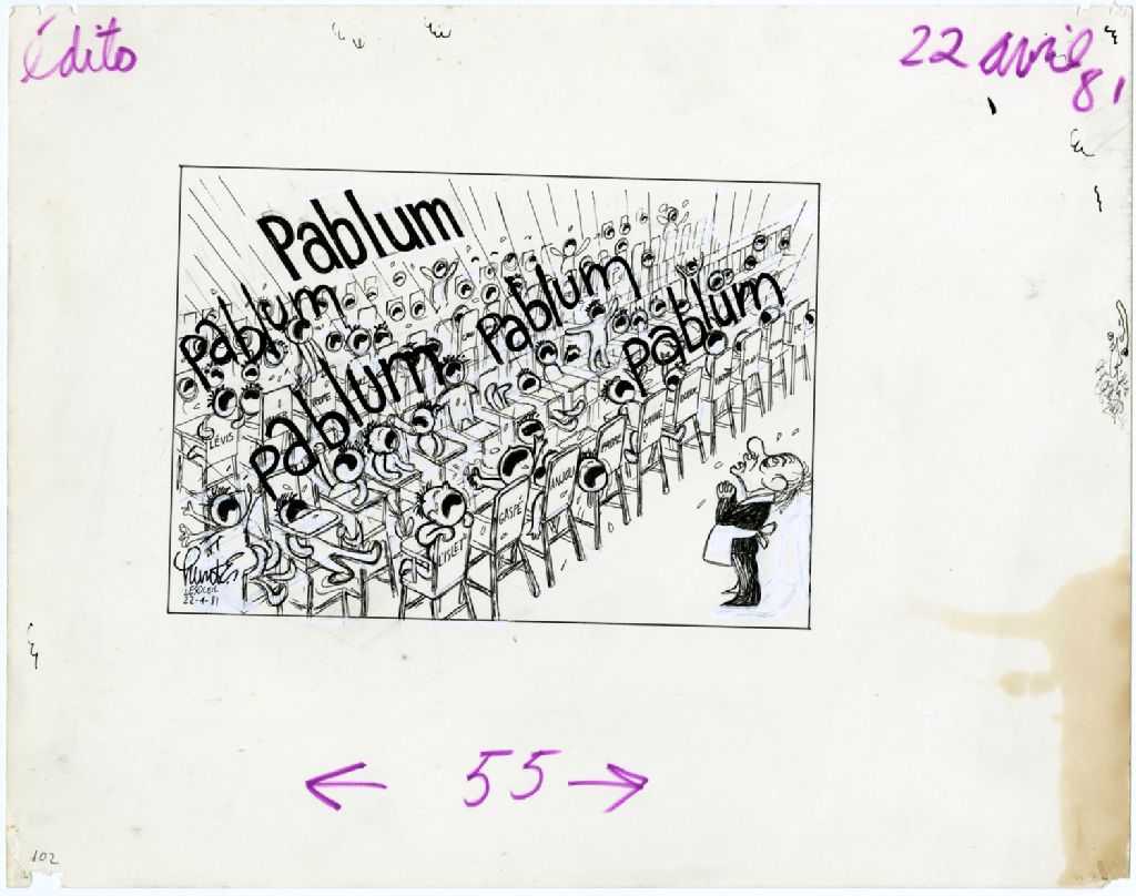 [René Lévesque devient des bébés dans des chaises hautes qui crient ''Pablum'']