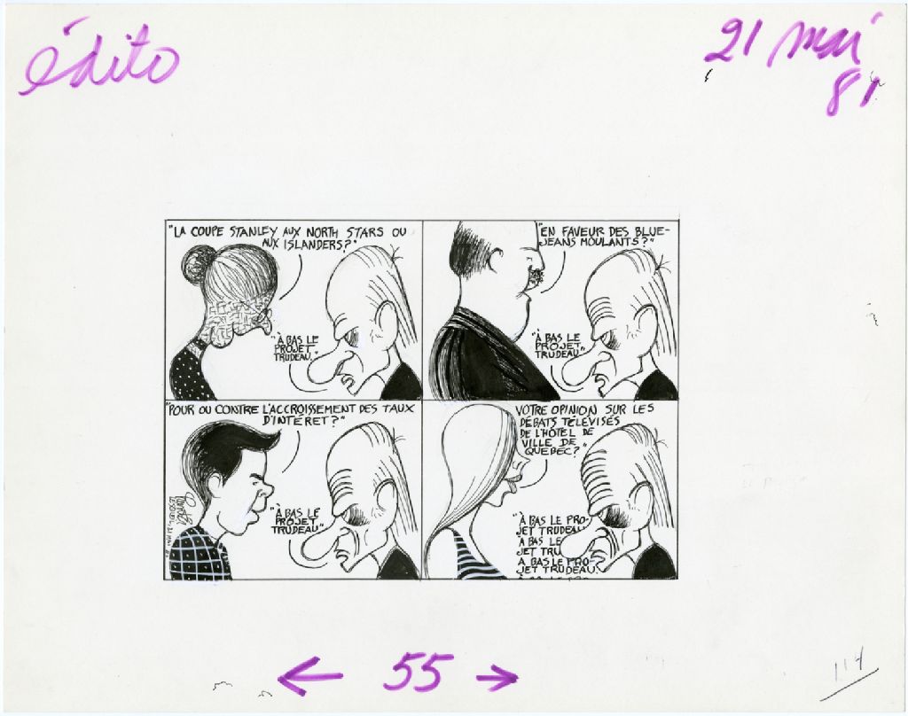 [Des gens s'adressent à René Lévesque]: ''La coupe Stanley aux Nort Stars ou aux Islanders?'' [René Lévesque]: ''À bas le projet Trudeau'' ''En faveur des blue-jeans moulants?'' ''À bas le projet Trudeau'' ''Pour ou contre l'accroissement des taux d'intérêt?'' ''À bas le projet Trudeau'' ''Votre opinion sur les débats télévisés de l'hôtel de Québec?'' ''À bas le projet Trudeau''