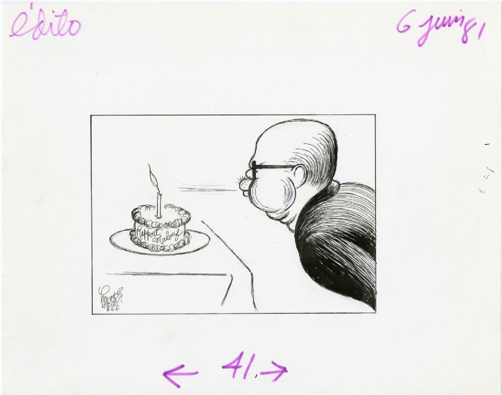 [Jean Drapeau souffle sur les bougie d'un gâteau où on peut lire ''Rapport Malouf'']