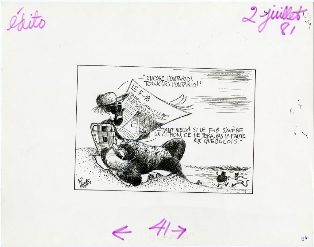 «Encore l'Ontario! Toujours l'Ontario!» «Tant mieux! Si le F-18 s'avère un citron, ce ne sera pas la faute aux Québécois.»