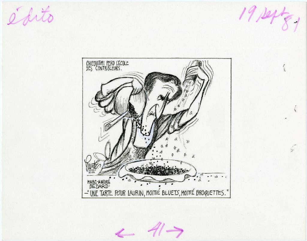 Chicoutimi perd l'école des contrôleurs. Marc-André Bédard : «Une tarte pour Laurin, moitié bleuets, moitié broquettes.», 19 septembre 1981, Archives nationales à Québec, Fonds Raoul Hunter, (03Q,P716,S1,P81-09-19), Raoul Hunter.