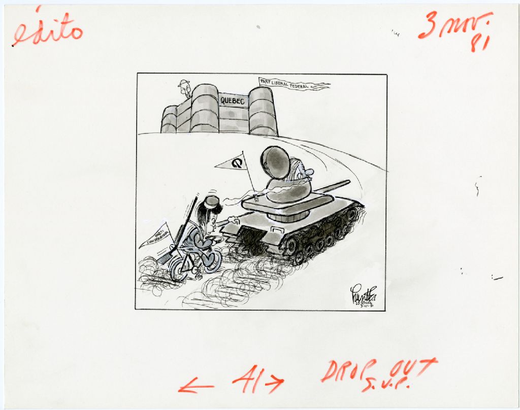 [René Lévesque dans un char d'assaut; Joe Clark en bicyclette qui se retient au char d'assaut]