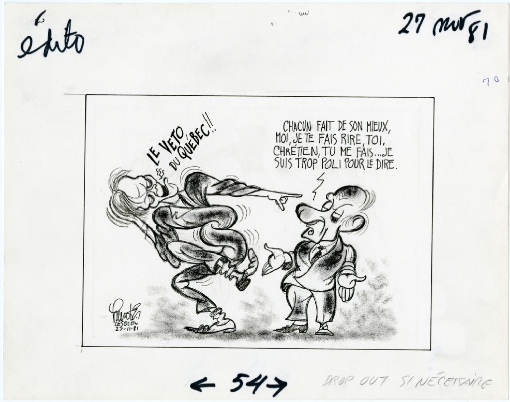 «Le véto du Québec!!» «Chacun fait de son mieux, moi, je te fais rire, toi, Chrétien, tu me fais... je suis trop poli pour le dire.»
