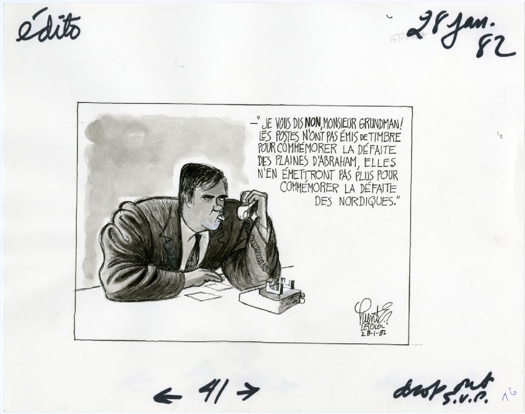«Je vous dis non, monsieur Grundman! Les Postes n'ont pas émis de timbre pour commémorer la défaite des Plaines d'Abraham, elles n'en émettront pas plus pour commémorer la défaite des Nordiques.», 28 janvier 1982, Archives nationales à Québec, Fonds Raoul Hunter, (03Q,P716,S1,P82-01-28), Raoul Hunter.