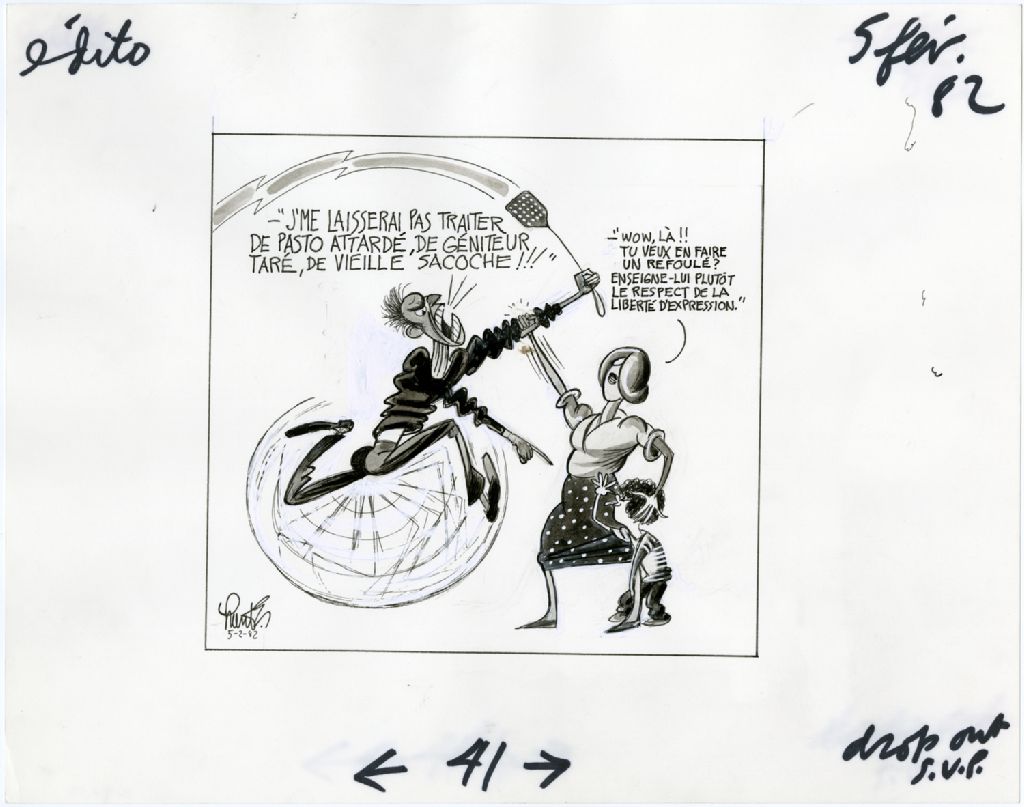 «J'me laisserai pas traiter de pasto attardé, de géniteur taré, de vieille sacoche!!» «Wow là!! Tu veux en faire un refoulé? Enseigne-lui plutôt le respect de la liberté d'expression.»