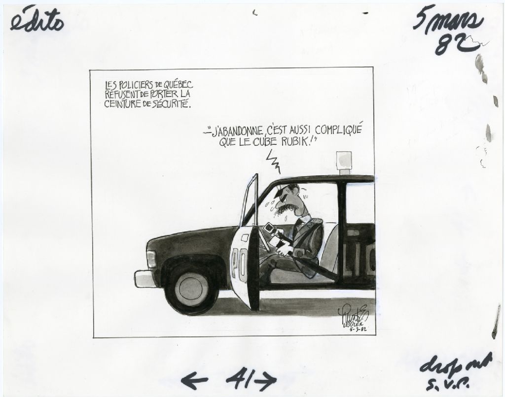Les policiers de Québec refusent de porter la ceinture de sécurité. «J'abandonne, c'est aussi compliqué que le cube Rubik!», 5 mars 1982, Archives nationales à Québec, Fonds Raoul Hunter, (03Q,P716,S1,P82-03-05), Raoul Hunter.