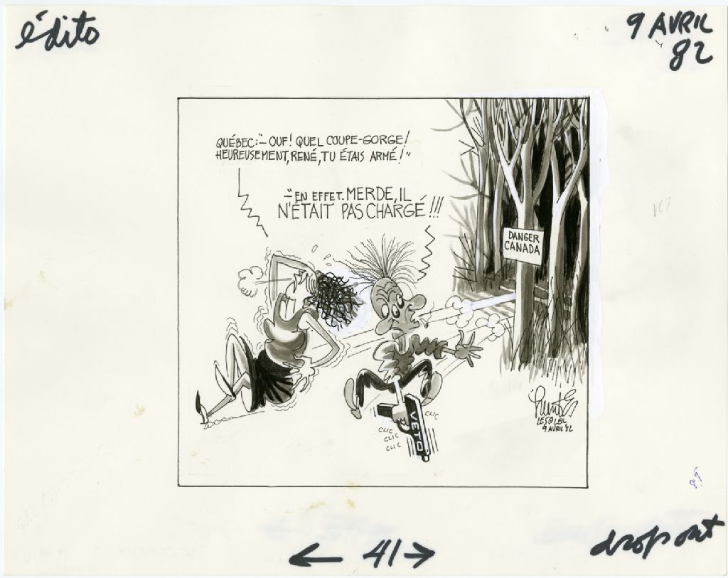 Québec : «Ouf! Quel coupe-gorge! Heureusement, René, tu étais armé!» «En effet. MERDE, IL N'ÉTAIT PAS CHARGÉ!!!»