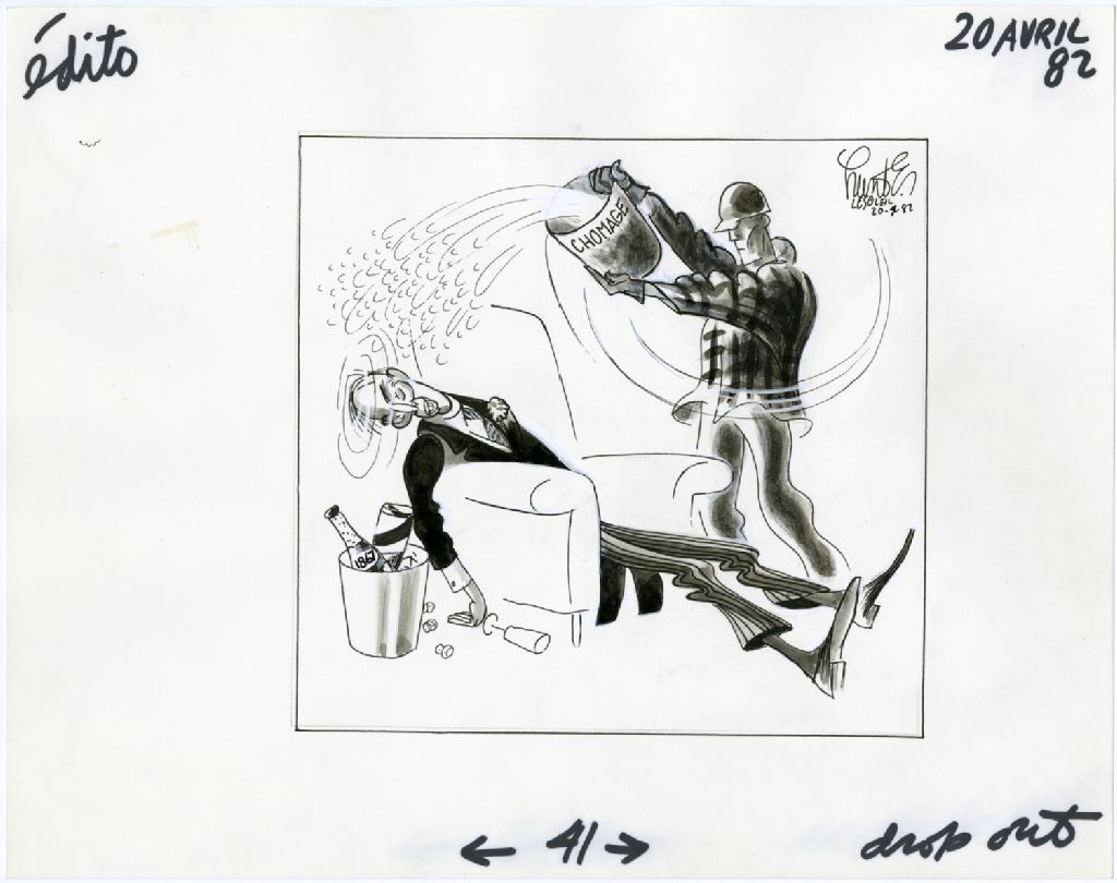 [Pierre-Elliot Trudeau endormi sur un fauteuil, un travailleur de la construction lui lance un sceau d'eau au visage], 20 avril 1982, Archives nationales à Québec, Fonds Raoul Hunter, (03Q,P716,S1,P82-04-20), Raoul Hunter.