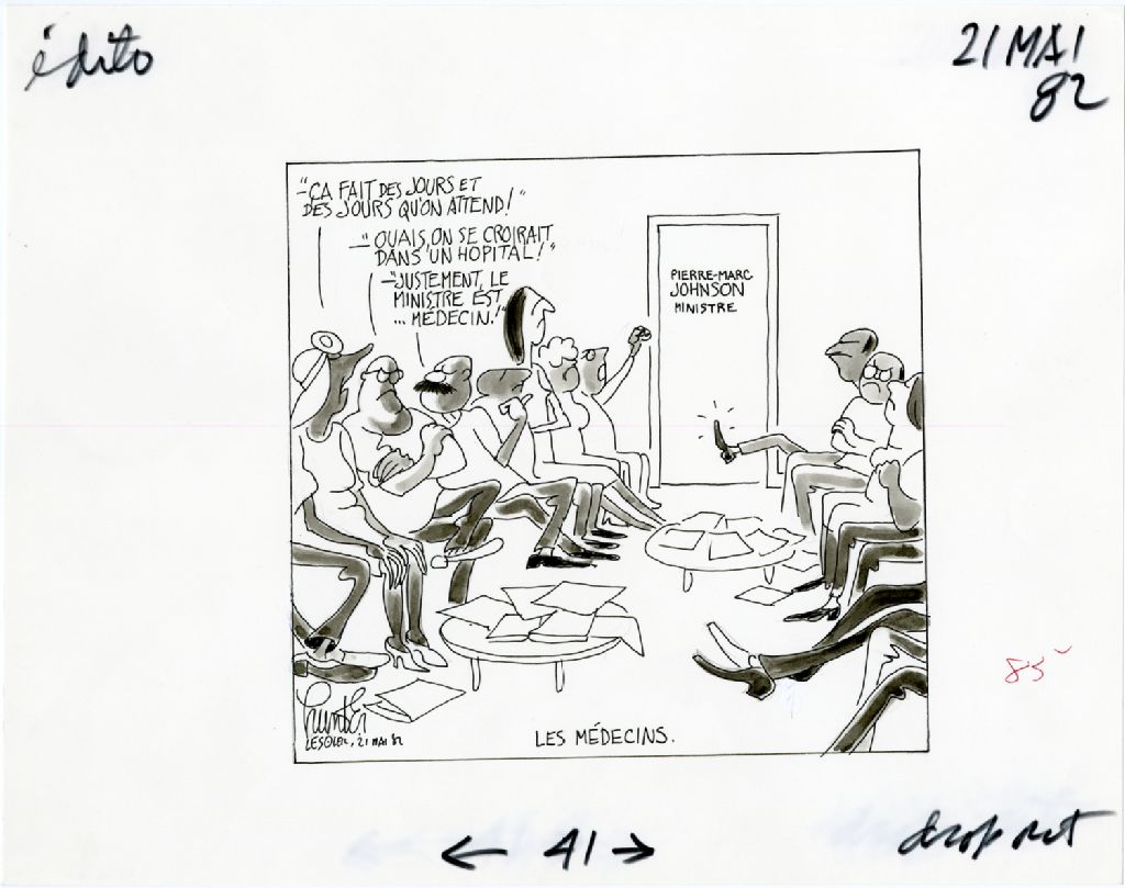Les médecins. «Ça fait des jours et des jours qu'on attend!» «Ouais, on se croirait dans un hôpital!» «Justement, le ministre est... médecin!»