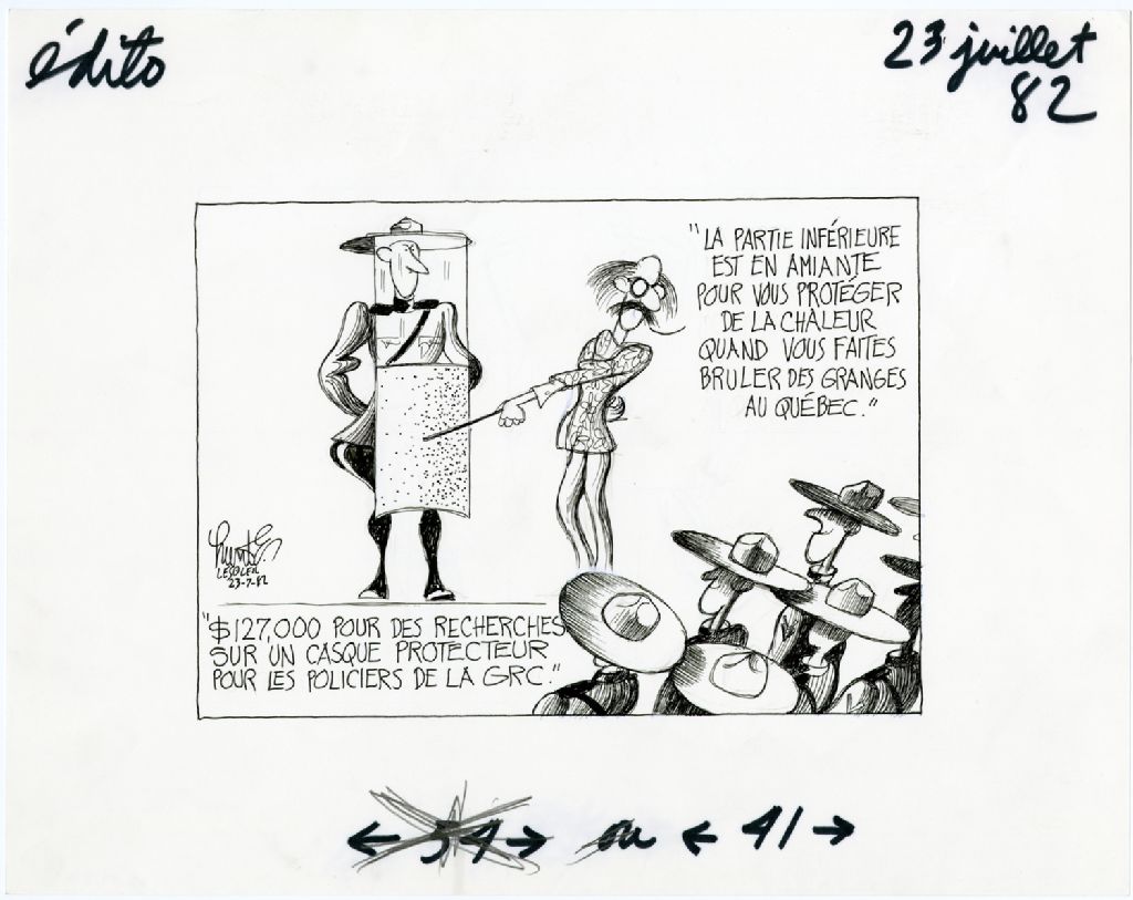 «$127,000 pour des recherches sur un casque protecteur pour les policiers de la GRC.» «La partie inférieure est en amiante pour vous protéger de la chaleur quand vous faites brûler des granges au Québec.»