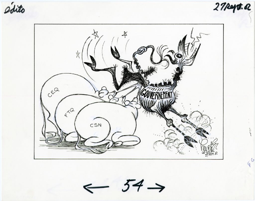 [Trois vaches où on peut lire ''CEQ'', ''FTQ'' et ''CSN'' tètent un animal rachitique où on peut lire ''Gouvernement''], 27 septembre 1982, Archives nationales à Québec, Fonds Raoul Hunter, (03Q,P716,S1,P82-09-27-1), Raoul Hunter.