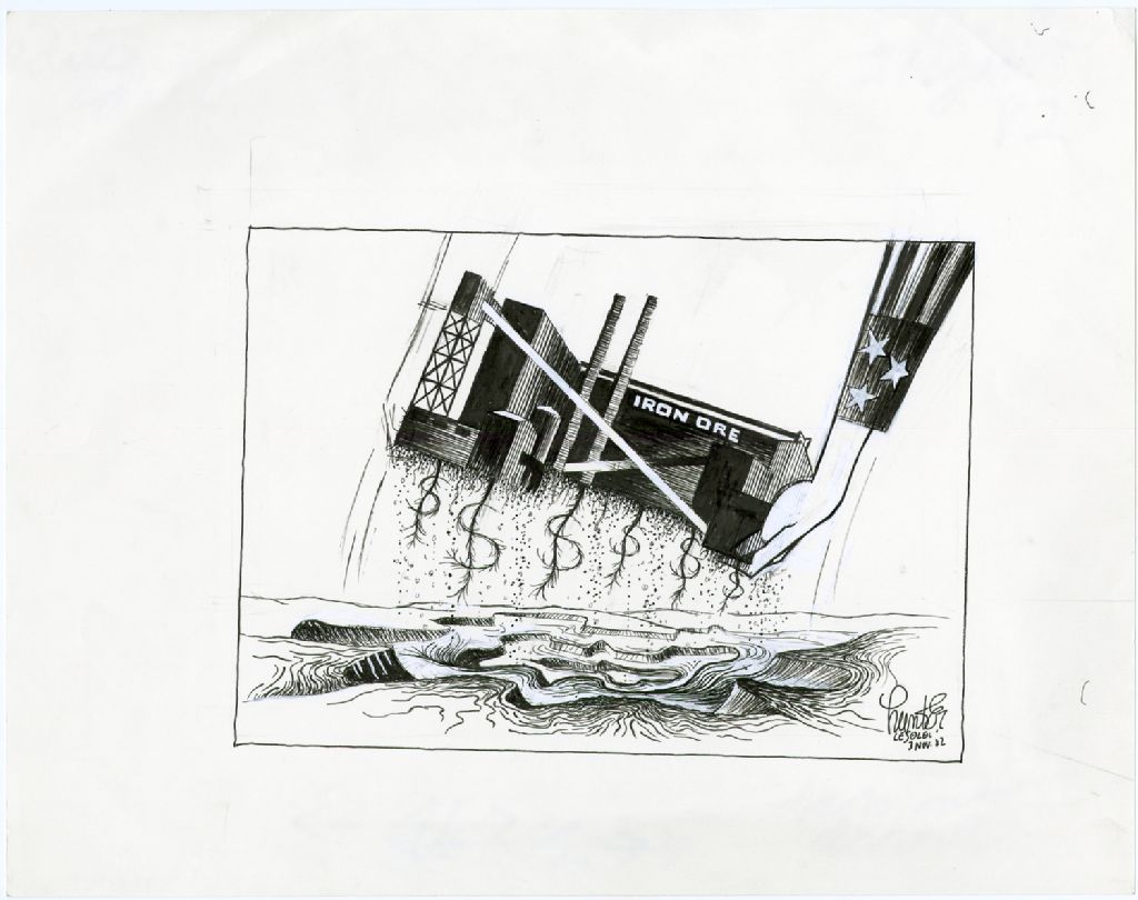 [Un bras avec une manche au couleur du drapeau américain soulève une usine]