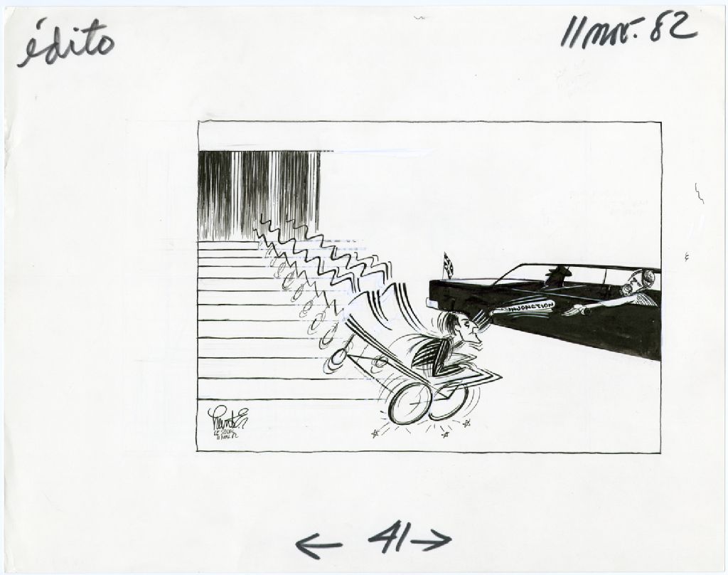 [Un homme descend un escalier dans une civière et tends un bâton où on peut lire ''injonction'' à Pierre-Marc Johnson ]